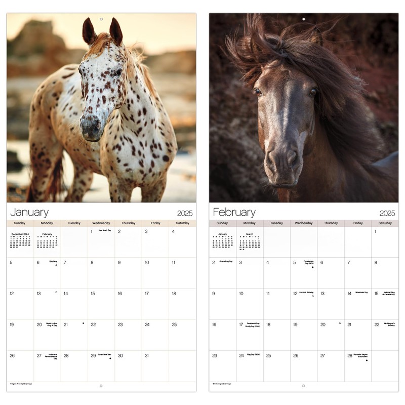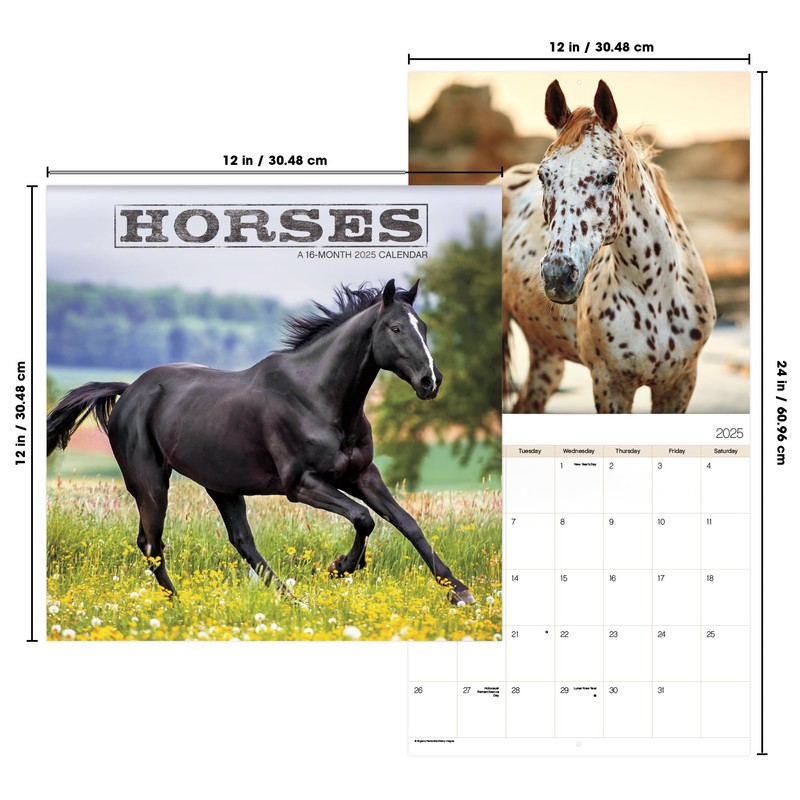• This 2025 Horses Wall Calendar features monthly pages for January to December 2025, as well as the last 4 months of 2024
