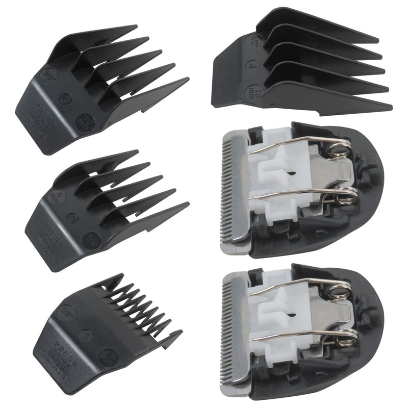 2x Clipper Trimmer Blade 1x Comb 1/8" 1x Comb 1/4" 1x Comb 3/8" 1x Comb 1/2"