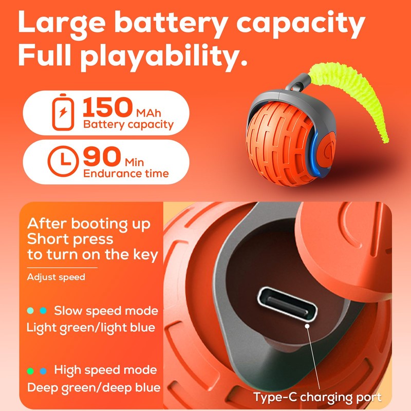 - Quick Charging, Extended Playtime for Non-stop Entertainment With a quick 30-minute charge, this interactive cat ball provides up to 6 hours of uninterrupted fun. Ideal for interactive cat toys and pet toys for cats, the efficient charging means your pet will always have something engaging to play with, cat toys for bored indoor kitten