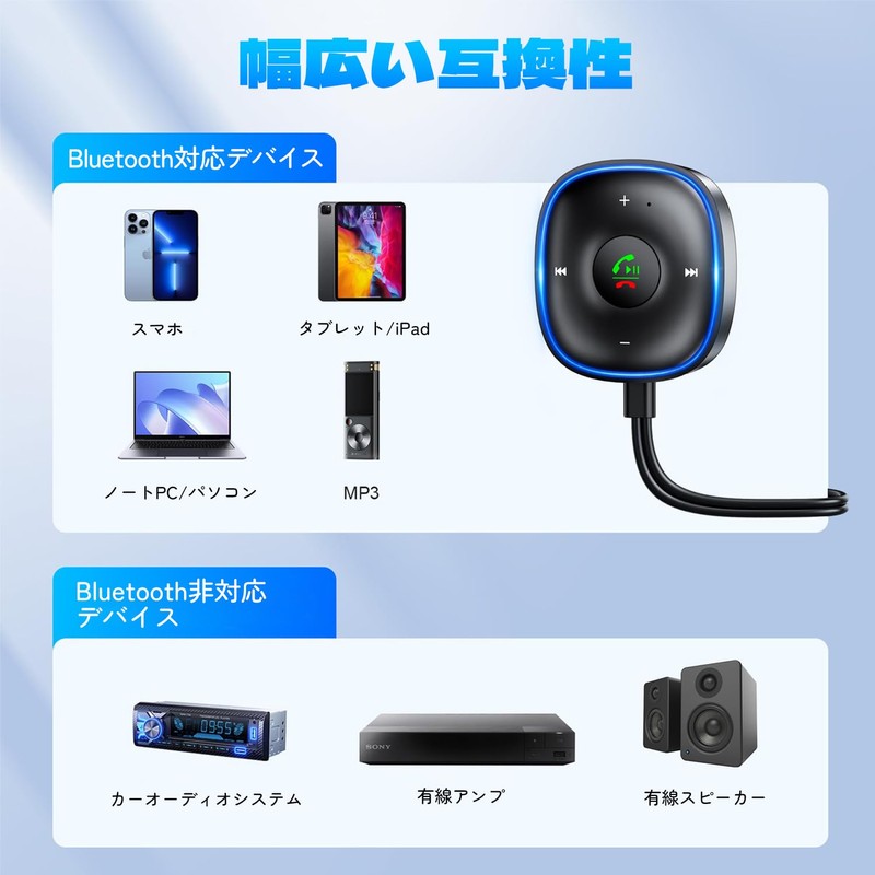 - Plug & Play & Dual Connection: Just plug it into a Bluetooth receiver audio with a 3.5mm jack, and it works immediately. Bluetooth receiver USB power automatically pairs with your smartphone when you turn on the car. You can seamlessly switch between music and hands-free in-car calls by connecting two devices simultaneously. (*When connected to two devices, only 1 music playback is supported.)