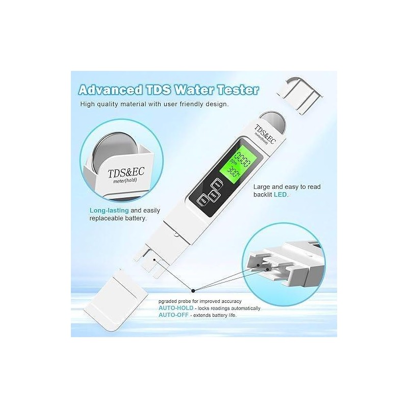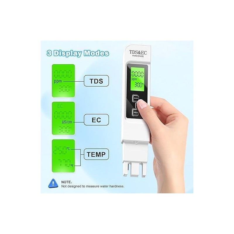All-in-One Precision Water Tester Test your water like a pro. This upgraded 4-in-1 digital TDS meter measures TDS (Total Dissolved Solids), EC (Electrical Conductivity), and Temperature (°C/°F) with high accuracy. Whether you’re monitoring drinking water, aquariums, or reverse osmosis systems, this tool delivers fast and reliable results.