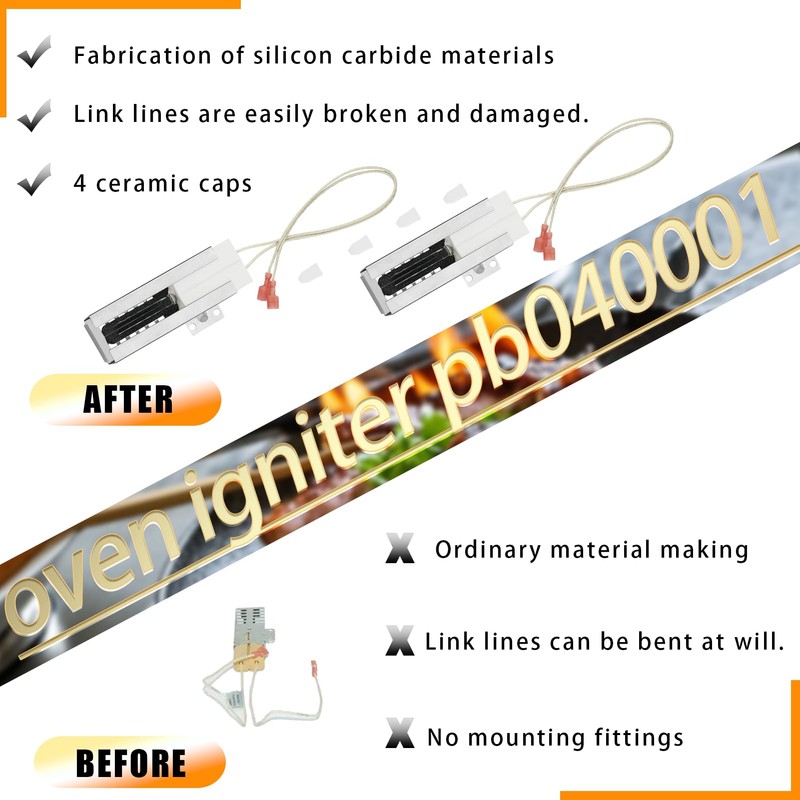 - Efficient and safe : Our oven igniter pb040001 is made of high-quality silicon carbide material, and protected by ceramics and stainless steel. Because the heating parts are fragile, we have added an anti-impact pad for convenient packaging to prevent damage on the way.Every igniter pb040001 has been tested to ensure high efficiency, safety and stability. (Don't store it in a humid environment. The discoloration of the heating part is normal because we have all tested it.)