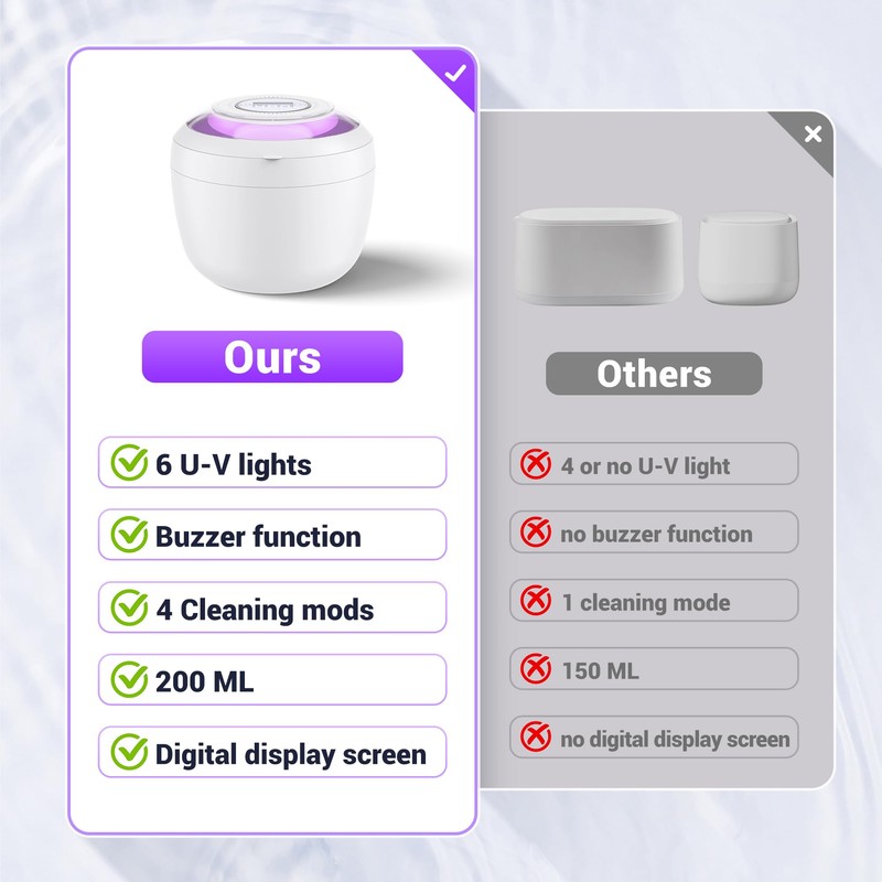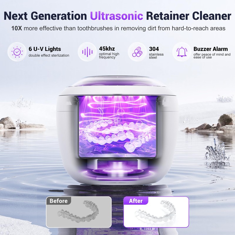- 【6 Powerful U-V Lights for 50% More Cleaning Efficiency】Say goodbye to odors and stains with our advanced ultrasonic retainer cleaner! Featuring 6 powerful U-V lights and 360° deep cleaning, it’s 50% more effective than standard ultrasonic cleaners and achieves 10X the cleanliness of a toothbrush. Perfect for retainers, braces, dentures, night guards, mouth guards, and even baby bottles, ensuring a spotless, hygienlc clean.