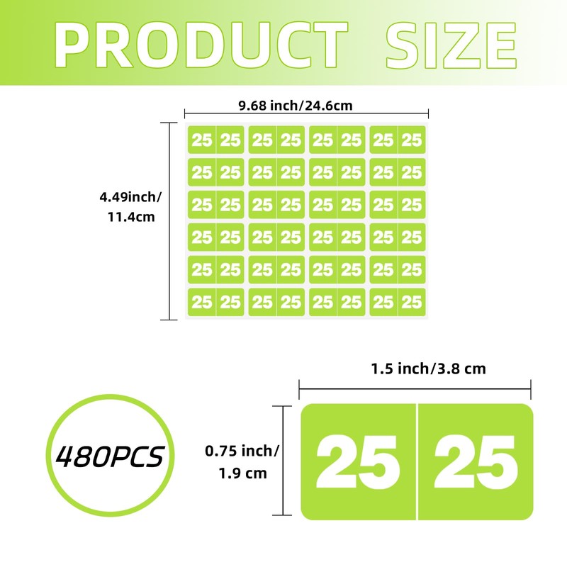 • 2025 Stickers: You will receive 1 pack of 2025 stickers, including 480 stickers, each measuring approximately 0.75x1.5 inches/1.9x3.8 centimeters. The labels are brightly colored and have the year "25" printed on them. These numbers tell you the arrival of the New Year in 2025 and make you look forward to life.
