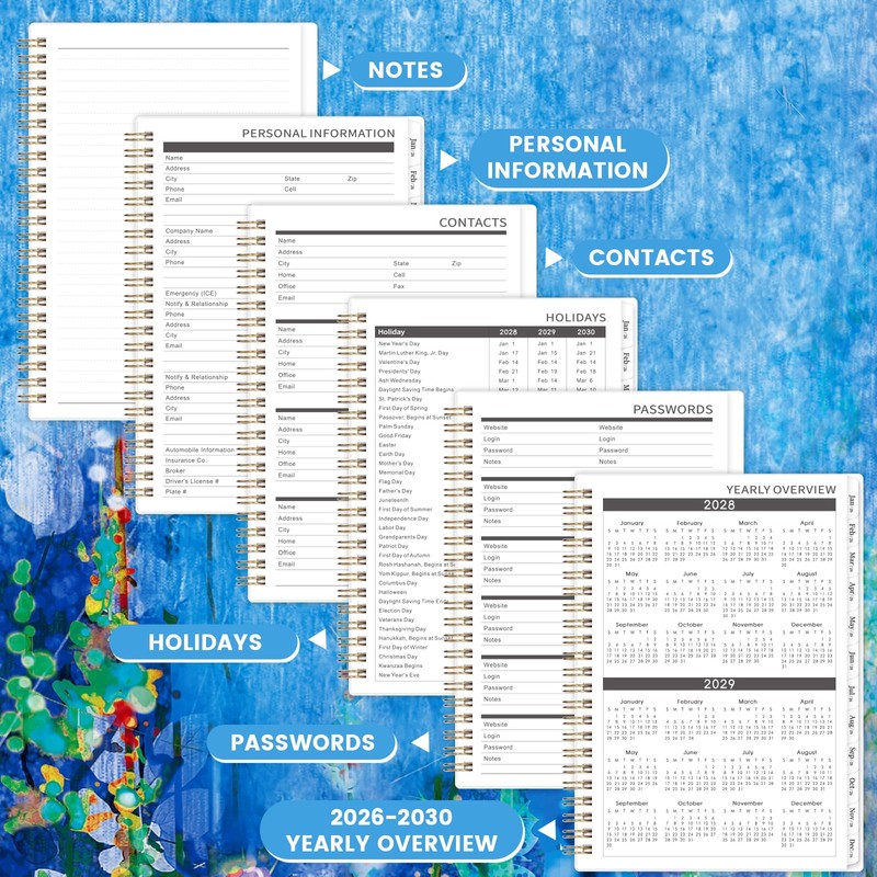 - 💦 CONTENT DESIGN - The 5 years monthly planner covers 60 monthly calendar pages + 4 important contacts pages + 7 contact pages + 5 password pages + 27 notes pages + 2026-2030 yearly overview + holidays + personal information page.