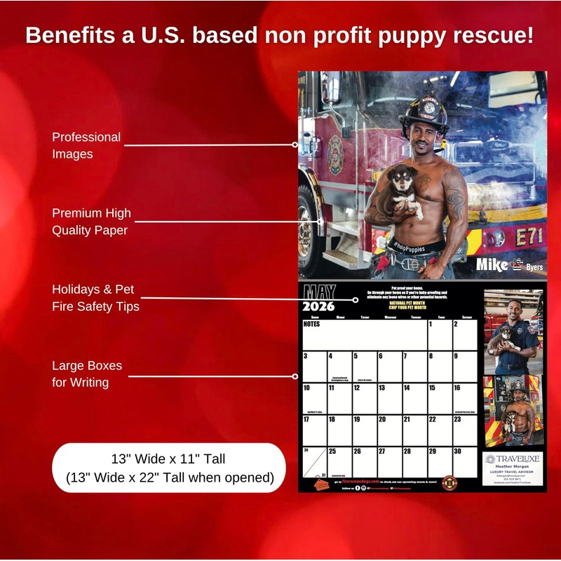- Proceeds benefit a U.S. based non profit puppy rescue! 13 Month calendar (Dec 2025-Dec 2026) Features 16 Male Firefighters! 13 x 11 (13 x 22 when opened) 1 Calendar Sold = 1 Puppy Saved Benefits Lifeline Puppy Rescue in Colorado, a 501(c)3 non-profit