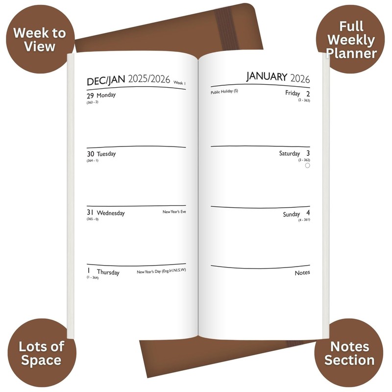 Plan your year with this elegantly designed 2026 Week to View Pocket Diary, available in black, brown and grey. Designed with a week to view layout that provides a clear and practical planning experience, allowing you to see your full week at a glance across double pages. This format is especially helpful for ADHD planning, student scheduling, and business appointments - making it a highly versatile choice.
