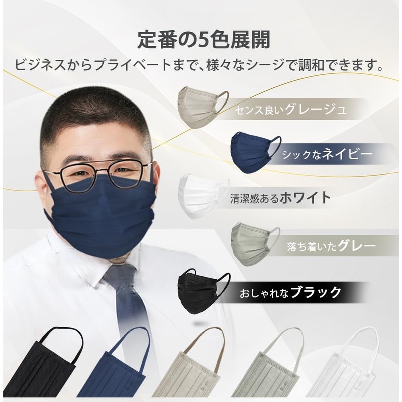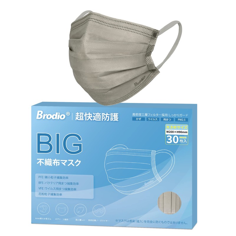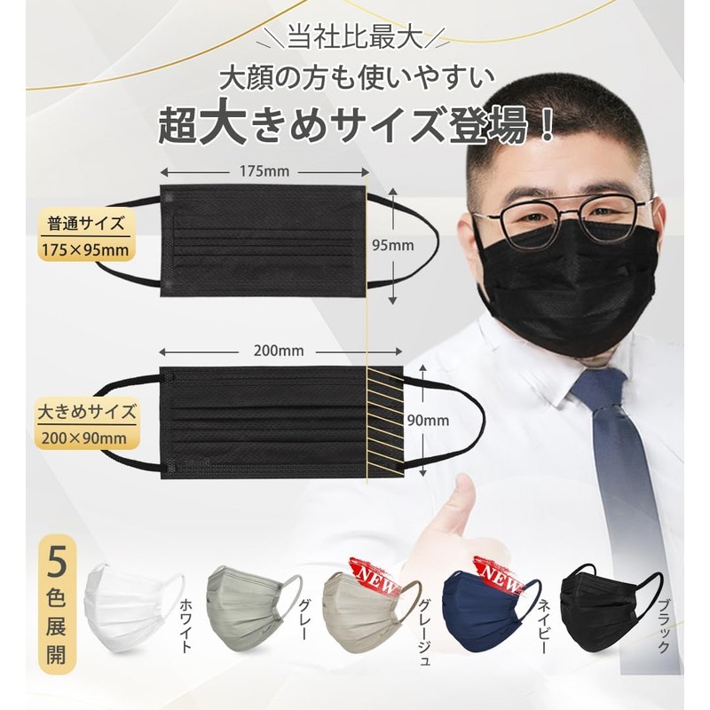 - 【超大きマスク 基本情報】黒、ホワイト、グレー3色、両面同色、色差なし、大きめサイズ 約20x9㎝、不織布 30枚入り、3層構造マスク、個包装、6mm幅広な耳ひも