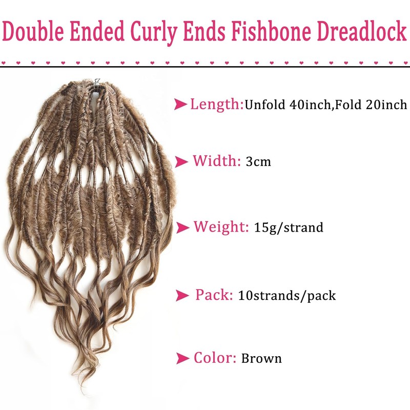 20inch Curly Dreads with FishBone Braid Boho Style Synthetic Double Ended Dreadlock Extensions 10 Strands Handmade Soft DE Dreadlock Extensions (Brown)