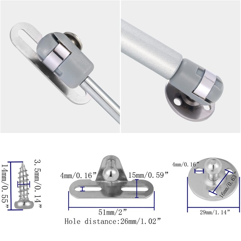 Product description: Size: 6 inch Feature: High strength material piston cylinder body is integrated with floor connecting rod, with stronger load and flexible switch. ABS gas brace: wear-resistant ABS with easy to open type card spring device. Easy to install, durable and stable. Round metal mounting plate: the contact area of the cabinet body is larger, three point positioning, installation is stronger. Applicability: Hydraulic support, automatic expansion. Applicable to drawer, kitchen cupboard door, cabinet and so on, most cabinets fit. Installation Method: 1. First install the gas support pipe part on the cabinet door for opening and closing. The installation size is about 2. 7 inches/70 mm from the cabinet door axis. The opening angle is 90 degrees. 2. Keep the cabinet door at 90 degrees, let the air door stretch freely, and then fix the supporting part of the air column to the cabinet door frame. Note: Make sure that the tube of the air support is facing upwards and the telescopic movable part of the support rod is facing downwards. If you want to make the counter open and close harder, the installation size may be 3. 9 inches/80-100 mm from the cabinet door connecting shaft, Specification: Type: Hydraulic Gas Lift Strut Support Rod Color: Silver Material: Stainless Steel + Nylon Pressure: 20N Load Bearing: 2-3kg Extendable length: 0-55mm Total Length: Approx. 190mm Fit for: Tip-up door, drop down door Package Includes: 4x 6 inch Gas stay hinge And some hardware Hassle-Free: Here with our 90-day money back risk-free purchase, Refund or Replacement for any quality problem.