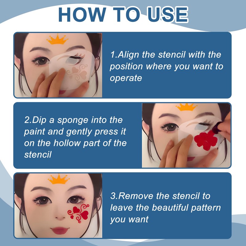 Made from durable and eco-conscious PET material, each stencil is washable. The 6.6x7.5cm size fits most faces, making them ideal for both kids face paint and other painting projects. Perfect when used with face paint sponge, face glitter for kids, or rainbow face paint block.