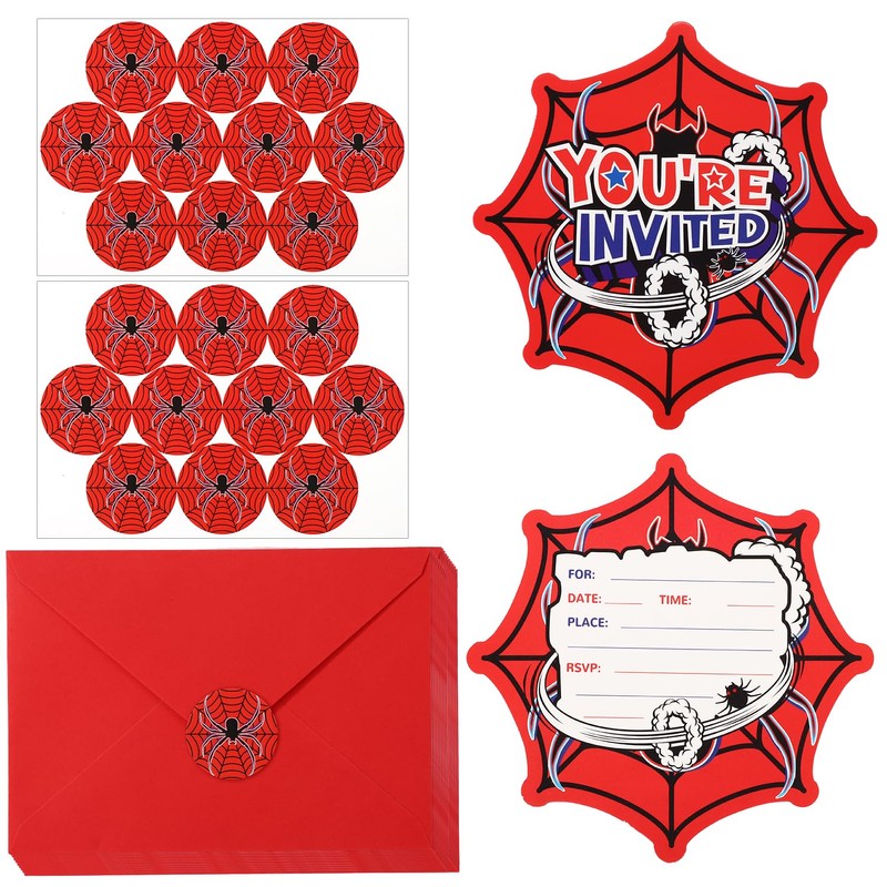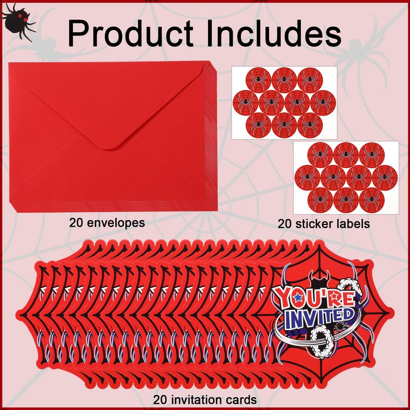 - Product Contents: This set includes 20 spider-themed invitation cards, 20 matching envelopes, and 20 sticker labels, plenty to cover all your party invitation needs.