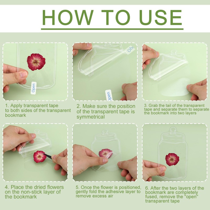 - Easy to Use: Split the transparent bookmark into two layers, insert the dried flowers, fold the adhesive layer over, smooth out any air, and let it set. Your custom, beautiful bookmark is done!