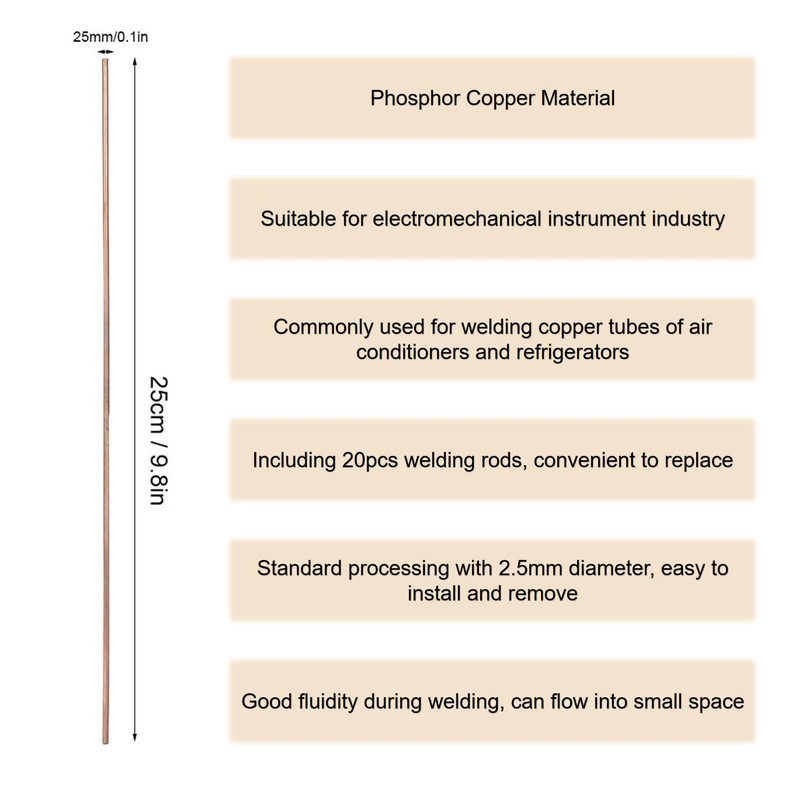 - EASY APPLICATION: With a length of approximately 25cm, these welding rods are designed for ease of use in welding refrigerator and air conditioner copper tubes. Their user-friendly size and material properties guarantee hassle-free installation and reliable performance, enhancing your welding experience.