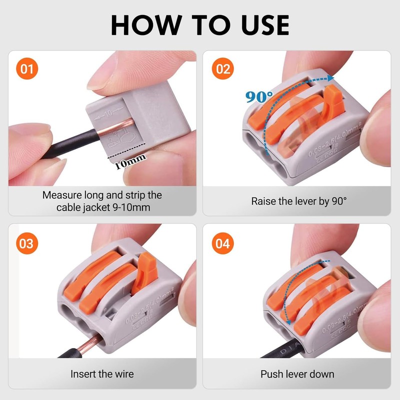 - 【Quick & Tool-Free Installation】 No more messy electrical tape! Just strip 9–10mm of wire, lift the orange lever, insert the wire, and close the clip. These lever wire connectors help reduce wiring time by up to 70%, making installation fast and hassle-free.