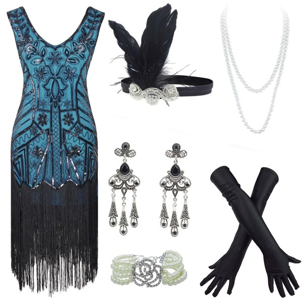 20s Flapper Gatsby Sequin Beaded Evening Cocktail Dress with Accessories Set (Small, Style02-Black&Blue)
