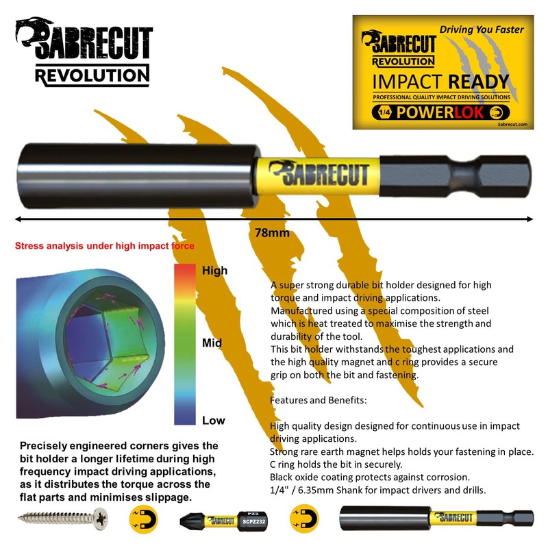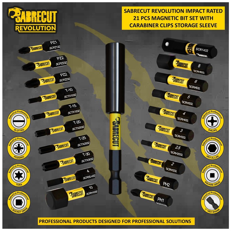 - 21 piece SabreCut 78mm Magnetic Impact Bit Holder and 20 x 32mm Magnetic Impact Bits (PH1, PH2, PZ1, 2 x PZ2, T10, T15, T20, T25, T30, H2, H2.5, H3, H4, H5, H6, H8, H10, SL4 and Square Drive Adapter) with storage sleeve