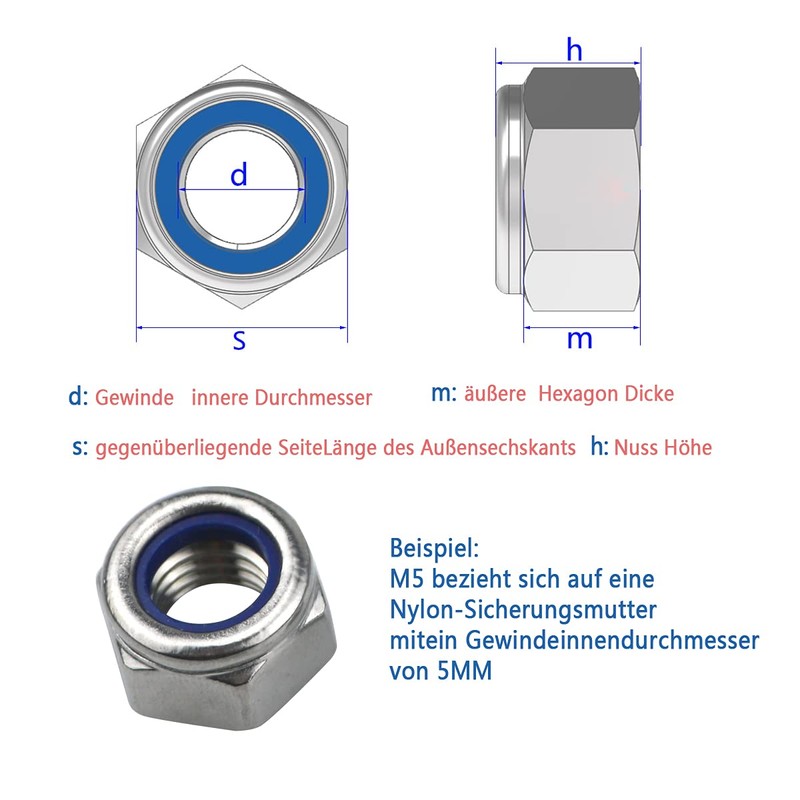 - 【High-Quality Material】: The outer hexagonal lock nut is made of 304 stainless steel, which is corrosion-resistant, anti-oxidation, sturdy and durable, waterproof and rust-proof. The inner insert is made of high-quality nylon ring, which strengthens the locking function, helps the nut to be locked tighter and prevents loosening