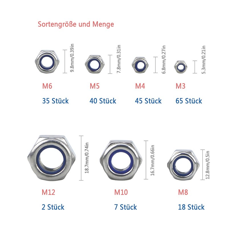 - 【Product Includes】: The product set includes 212 pieces of 7 different types of nylon lock nuts, including 65 pcs M3, 45 pcs M4, 40pcs M5, 35pcs M6, 18pcs M8, 7pcs M10, 2pcs M12, and different types meet different requirements. Demand also promotes the matching and use of equipped products, saving your choice cost.