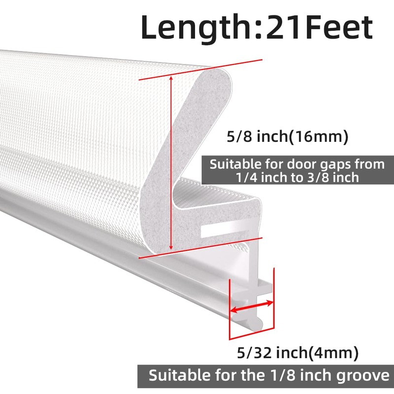 - Sufficient length: Our kerf weatherstrip are available in 3 colours, black, white and brown, in a length of 6.5m (21feet), which is perfectly sufficient to adhere to the gap around the door and fits most sizes of doors. The plastic flange of the kerf weather seal fits door gaps from 0.31"-0.5", please measure the width of the door gap before purchasing to choose the right weatherstripping