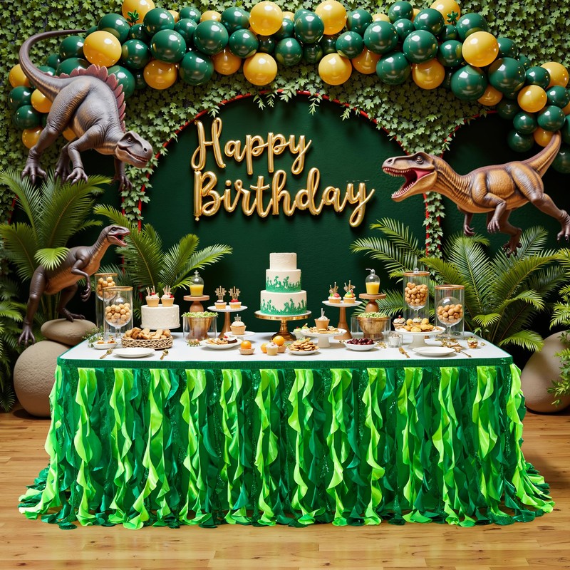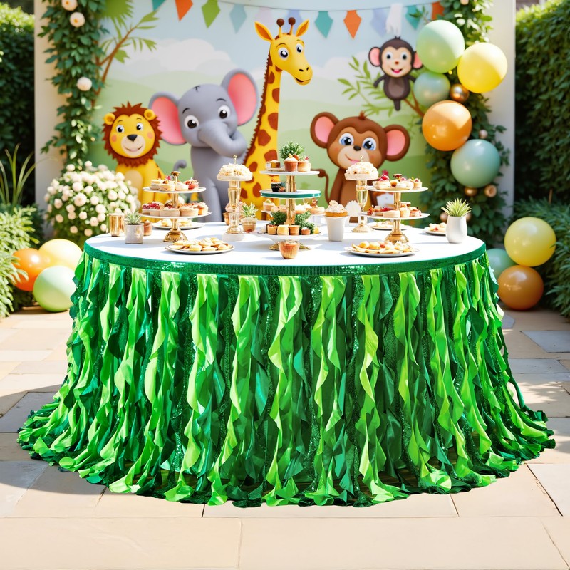 • Hawaiian Mermaid Ruffled Table Skirt:The mermaid ruffled table skirt is suitable for St. Patrick's Day,Hawaiian party night, garden beach party, luau, tropical beach party, wedding party,birthday,forest zoo theme,rain forest jungle themed parties.the green table skirt match with tropical palm leaves,flowers,green balloons and other party decorations will make your party more beautiful and elegant.