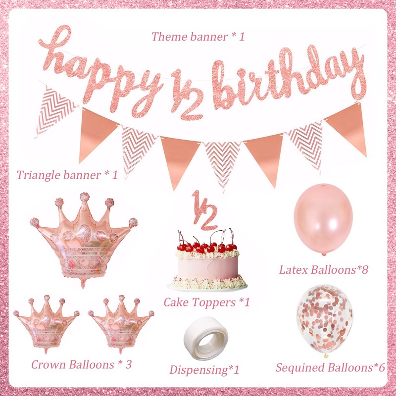 - Package List: You will receive 21 pieces of half birthday decorations, our baby birthday decorations set includes 1/2 pull flag, 1 pennant, 1 cake topper, 8 latex balloons, 6 sequin balloons, 3 crown balloons, 1 roll of glue dots, sufficient quantity to meet your daily needs, let your baby's half birthday party full of style and fun.