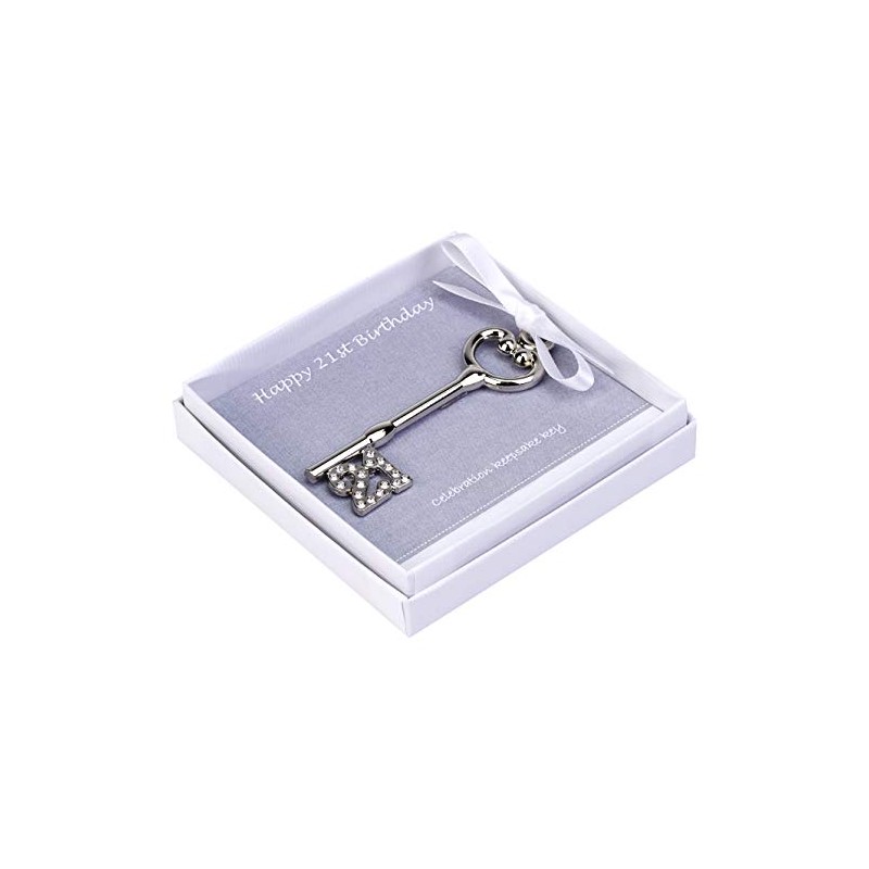 A great birthday idea for a 21st! Made from shiny metal, the key is tied with a satin ribbon and comes in a smart white presentation box with a smart grey printed box insert card saying Happy 21st Birthday.