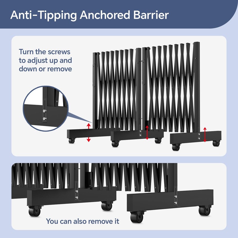 - Adjustable L-foot anchors:Our folding security gate adds L fixing feet, which can be fixed on the ground for a long time to prevent tipping over. It is adjustable up and down and can be removed if you don't need it.