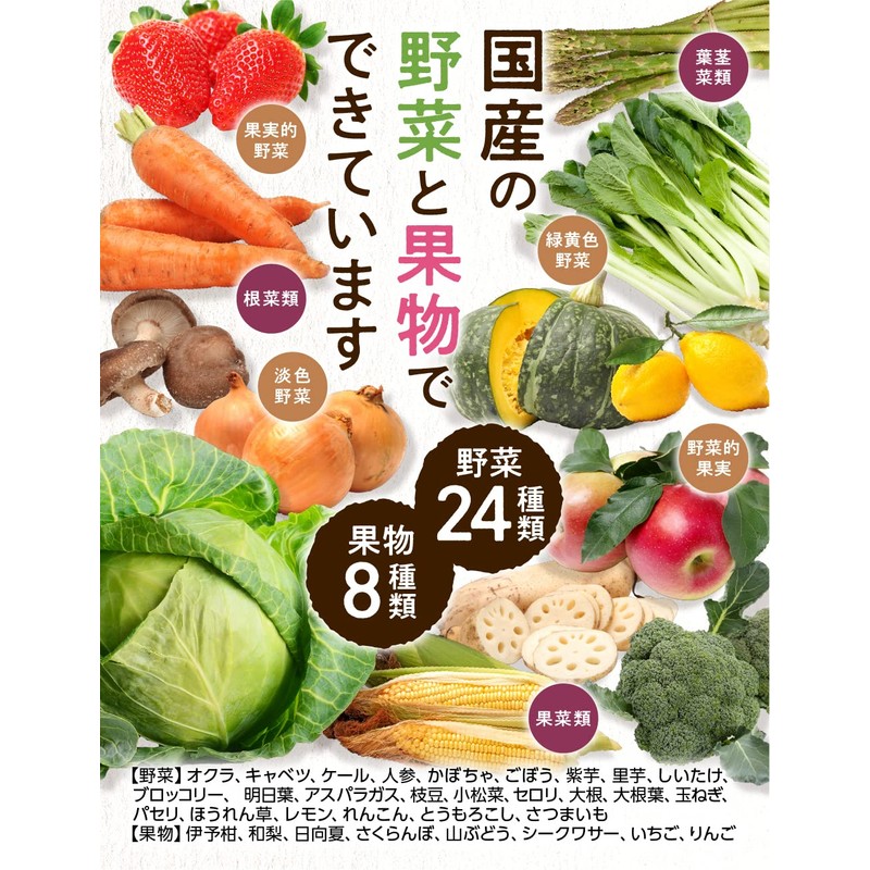 - 国産野菜を24種類配合。日本全国の太陽と大地のちからをぎゅっと凝縮