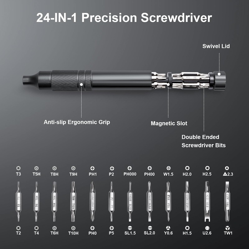- 24 in 1 Small Screwdriver Set: Our Mini Screwdriver Set includes Phillips Tool (PH000, PH00, PH0, PH1), Slotted Tool (SL1.5, SL2.0), Torx Tool (T2, T3, T4), Torx Security Tool (T5H, T6H, T8H, T9H, T10H), Hex Tool (H1.5, H2.0, H2.5), Y-shaped Tool (Y0.6), W-shaped Tool (W1.5), U-shaped Tool (U2.6), Tri-Wing Tool (TW1), Triangle Tool (TA2.3), Pentalobe Tool (P2, P5) , Ensuring you have the smallest yet most complete screwdriver tool kits to accommodate a variety of applications.