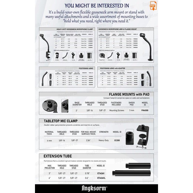 - HEAVY DUTY ARMS - Our flexible gooseneck tube arms come in 6", 9", 13", 19", and 24" lengths, available in very-light, medium-light, light, heavy, and super-duty strengths. The 19" and 24" options feature heavy arms, capable of supporting heavier microphones like the SM7B, SM57, and most other mics. We have thousands of flexible gooseneck tubes in stock and ready to ship, with custom designs also available. Angksorm is your source for high-quality flexible gooseneck tubing!