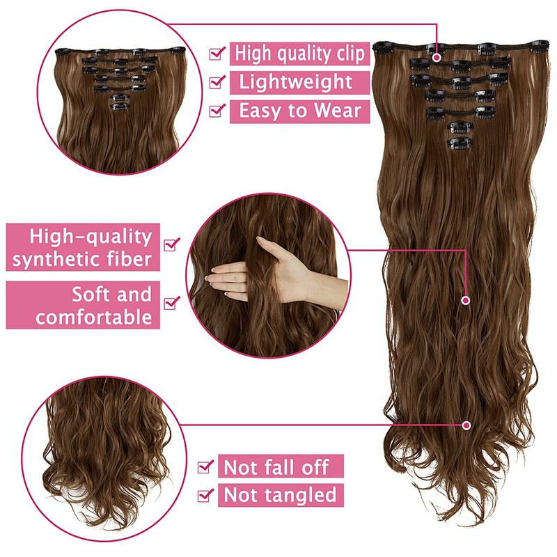 - Product Information - 7PCS/set, 16clips, 160g. The natural length is 23/24 inches (8 inches, one 4-card hair clip, 6 inches, two 3-card hair clips, 4 inches, two 2-card hair clips, 2 inches, two 1-card hair clips), and different styles will bring you a variety of effect.