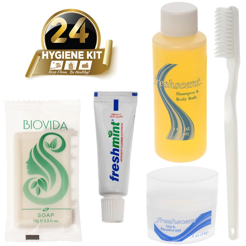 - EACH KIT INCLUDES - Each kit includes: 2 oz. Shampoo and Body Bath (clear bottle), #1/2 Deodorant Soap (vegetable based), .5 oz Stick Deodorant, 0.6 oz Toothpaste, 30 Tuft Toothbrush