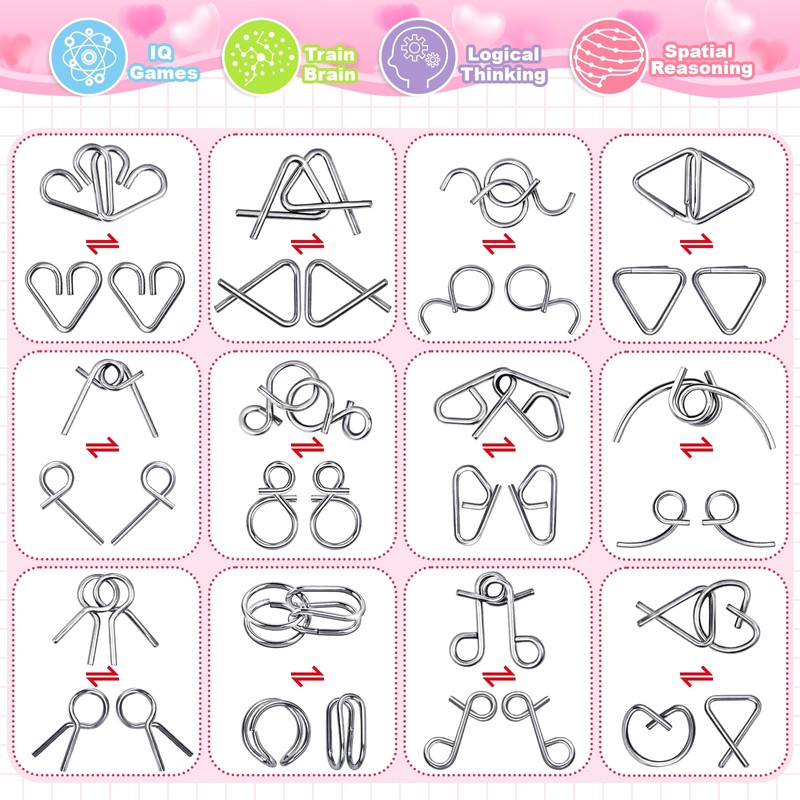 - Fun Brain Teaser Puzzles: With 12 distinct Brain Teaser Puzzles, the puzzles toys set are perfect for both adults and kids who thrive on challenges. They not only help relieve stress and promote relaxation but also effectively hone patience and attention. Just following the detailed instructions to effortlessly disengage the interlocked Metal Puzzles. These puzzles toys enhance logical thinking and problem-solving skills. Fun Valentine classroom favors for kids!