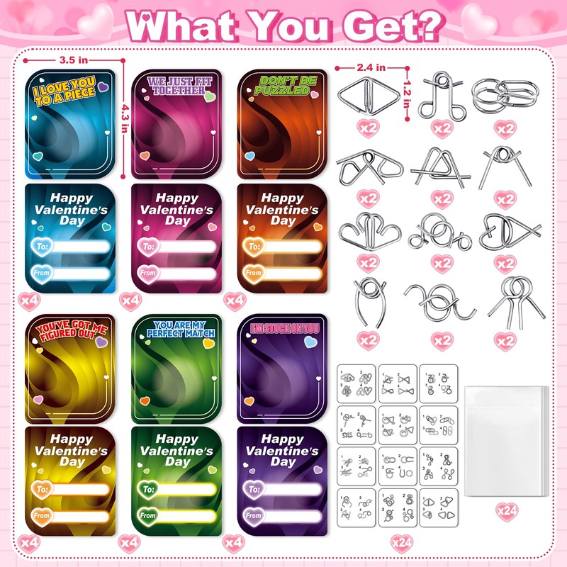 - Valentines Day Cards for School Kids: Package includes 24 kids valentines day cards, 24 metal puzzles, and 24 OPP bags. The set includes 6 different color-styled valentines day cards for kids, with 4 of each style; and 12 unique Brain Teaser Puzzles, with 2 of each design. Plus, the 24 OPP bags allow for easy packaging of the cards and puzzles, used to make class valentines cards for kids.