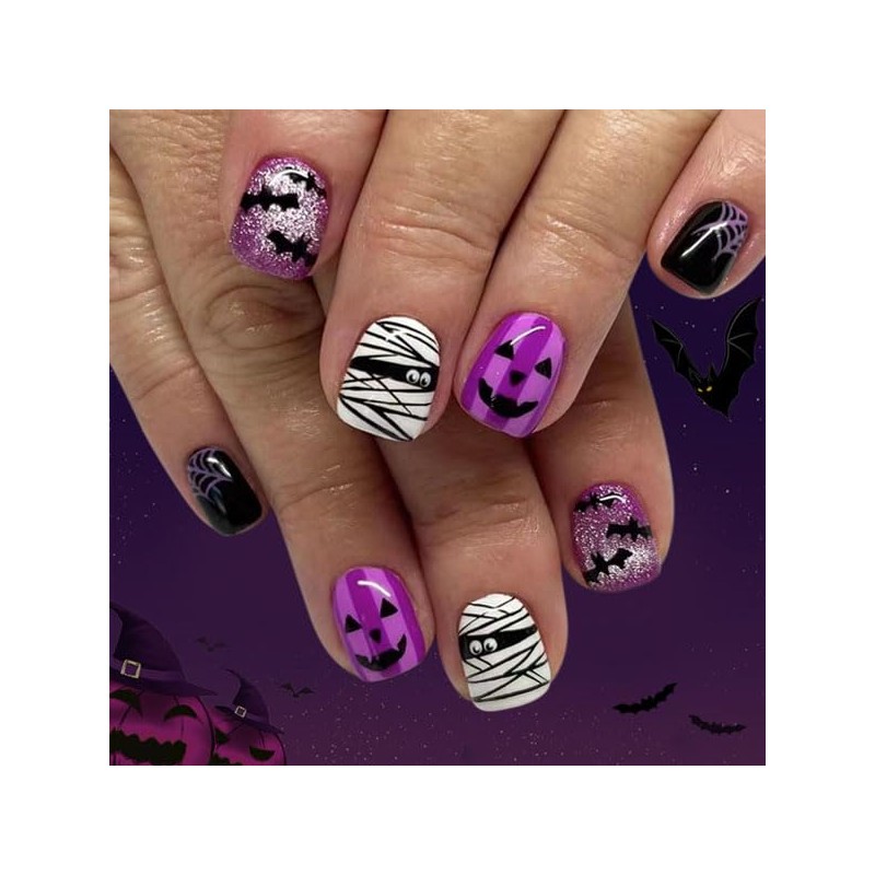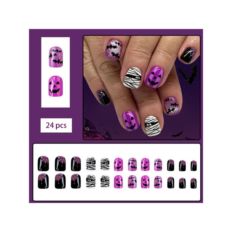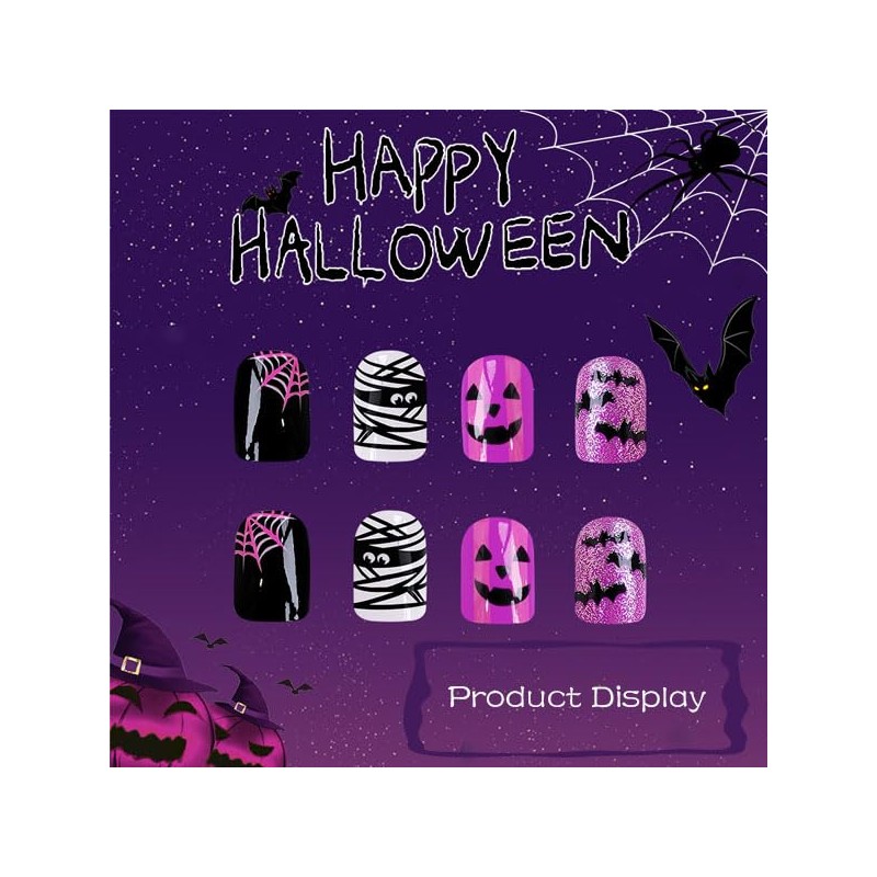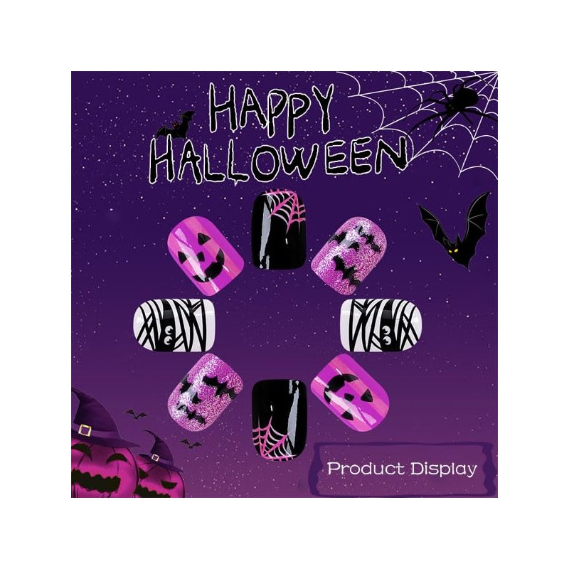 - ❣️【Halloween grimace】This fake nail is designed with Halloween elements as its theme, embellished with spiders and bats, and paired with a mysterious purple color, let's feel the unique Halloween atmosphere together!