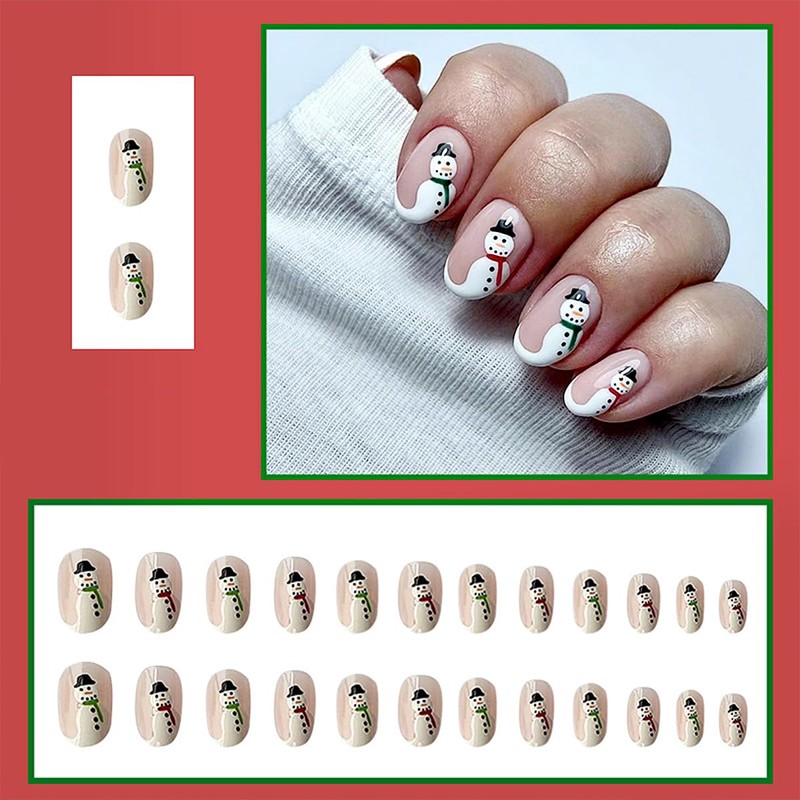 - ⛄【Festive Winter Design】: These medium oval press-on fake nails feature a charming red and green snowman scarf white french design, perfect for adding a touch of holiday cheer to your style. Whether you're attending a Christmas party or simply want to embrace the winter season, these nails are the ideal accessory.