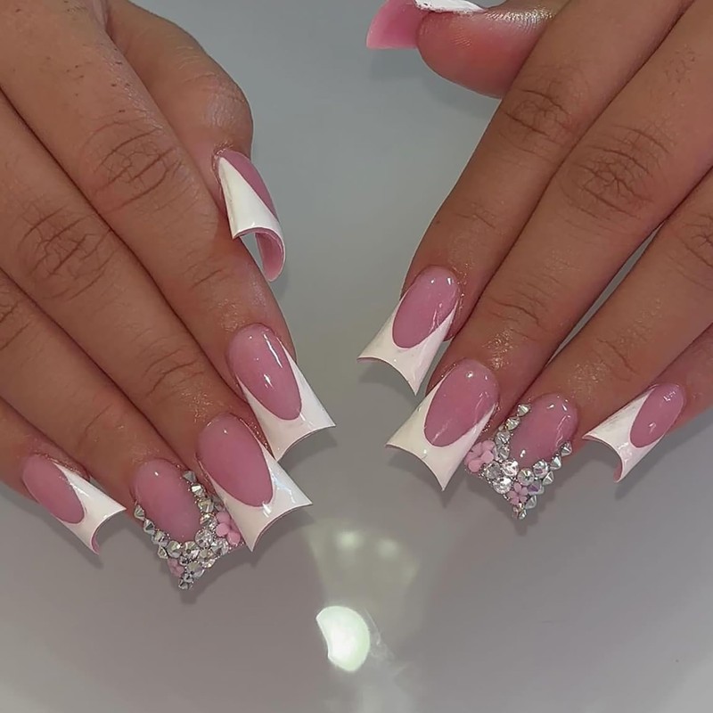 24 Pcs Rhinestones Press on Nails French Fake Nails with 3D Flower Designs Acrylic Duckbill False Nails Kit Full Cover Duck Nail Tips Duck Nails Press ons Cute Stick Glue on Nails for Women Girls
