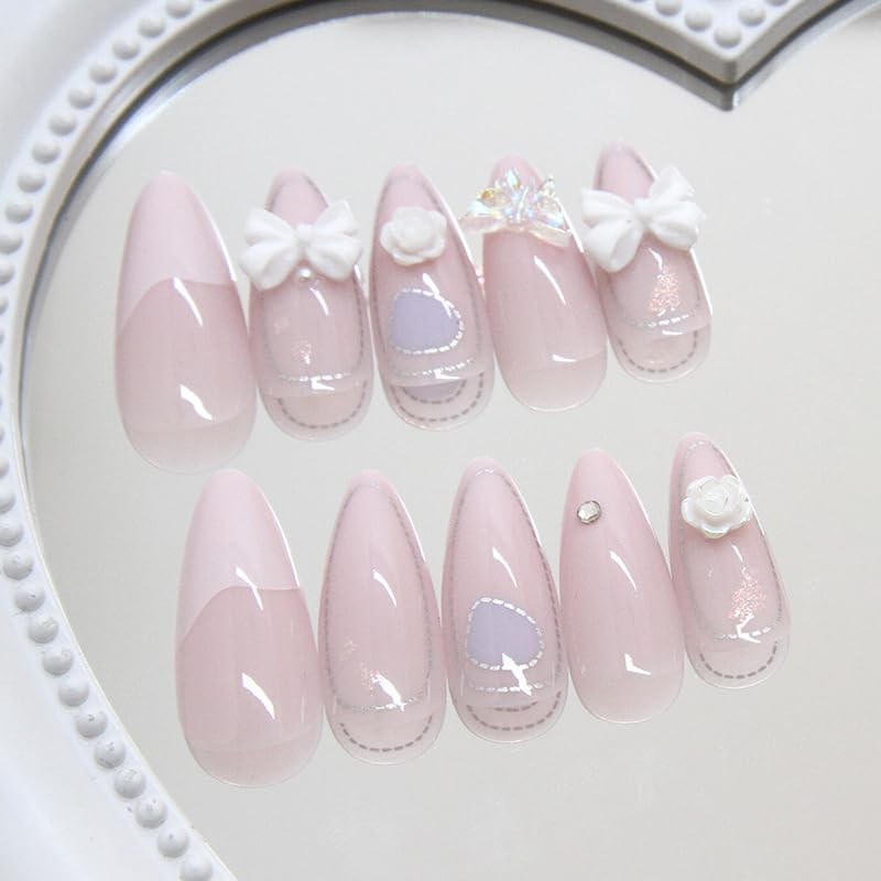 24 Pcs Spring Press on Nails Short Almond,YIHONGYAN 3D Butterfly Bow Charms Fake Nails Press ons French Nail Tip Acrylic Nail Art Kit Glue on Nails Full Cover False Nails Glitter Stick on Nails Women