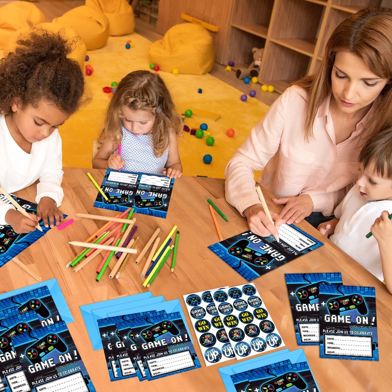- Package Includes: you'll get 24 pieces video game invitations, 24 pieces white envelopes and 30 video game stickers, totally 78 pieces; Game stickers have 5 cute designs and enough to stick all envelopes; Besides, you can easily seal the envelope up by the sticker, ensure the cards don't fall out