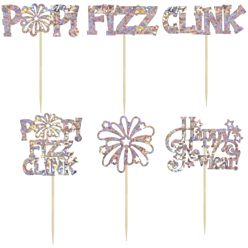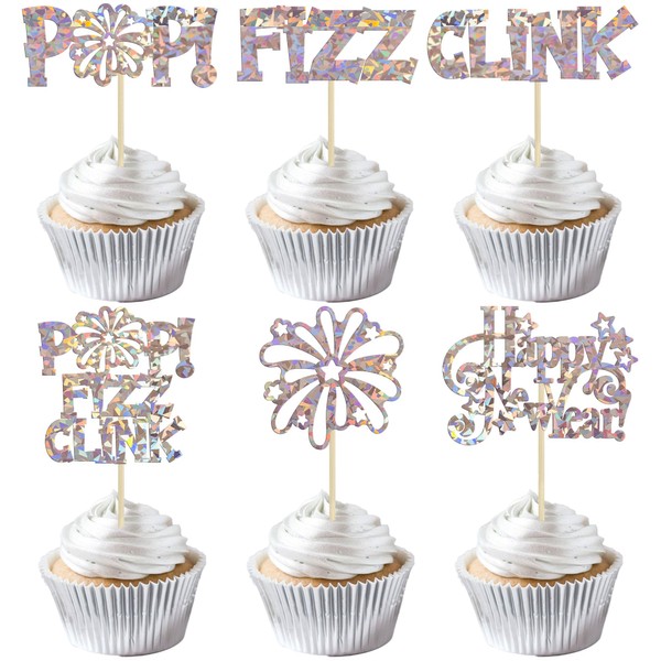 24 piezas de adornos para cupcakes de feliz año nuevo 2024 con purpurina de bienvenida 2024 fuegos artificiales Fizz Pop Clink decoraciones para cupcake para 2024 Happy New Year, suministros de fiesta