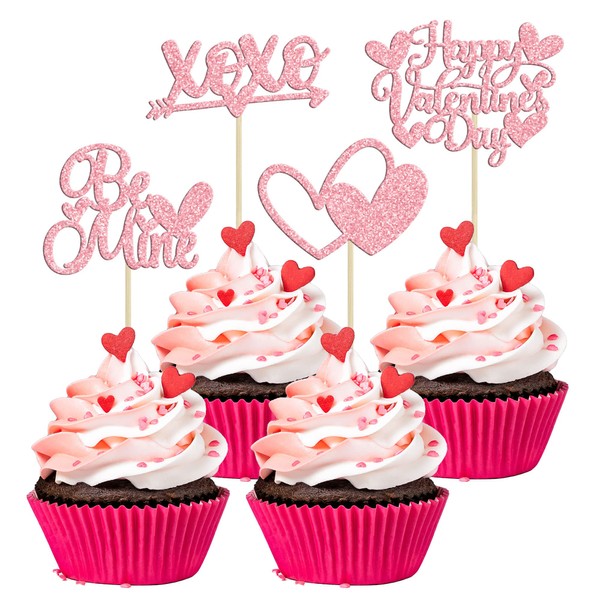 24 piezas de decoración rosa para magdalenas del día de San Valentín con purpurina rosa con corazón de amor ser mío, palillos para magdalenas, temática del día de San Valentín, boda, compromiso, fiesta, decoración de pasteles