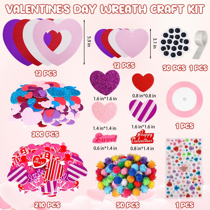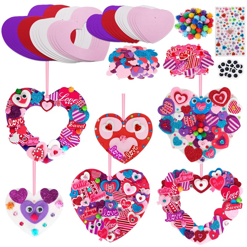 - Valentine Craft Kits: Valentine's Day foam heart craft kits includes 24 heart foam wreath bases, 210 Valentine's Day heart foam stickers , 200 foam glitter heart foam stickers, 50 black googly eyes, 50 pom-poms, 1 sheet of rhinestone stickers, 1 roll of glue dots and 1 roll of ribbon, enough for you to DIY your beautiful Valentine’s Day wreaths.
