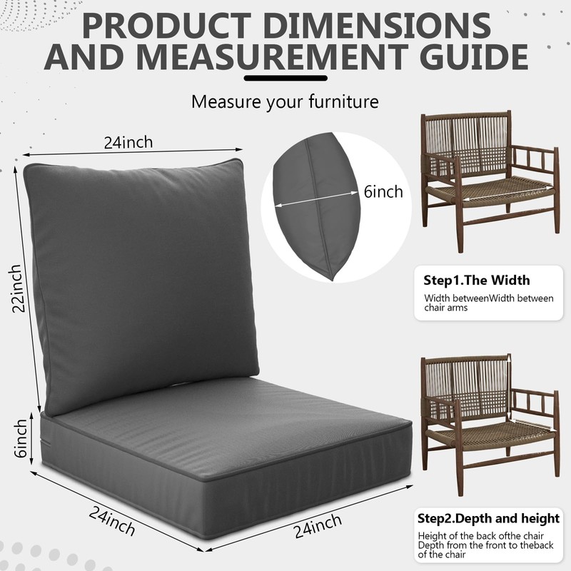 - 📏【2 Set Deep Seat Cushions】:2 sets patio furniture cushions fit various patio furniture chairs. The size of this patio chair cushions is: 24 "x 24" x 6“.These patio cushions Include 2 Pack -Seat cushions (24Lx24Wx6H Inch), 2Pack-Backrest pillow cushions (24Lx22W Inch).