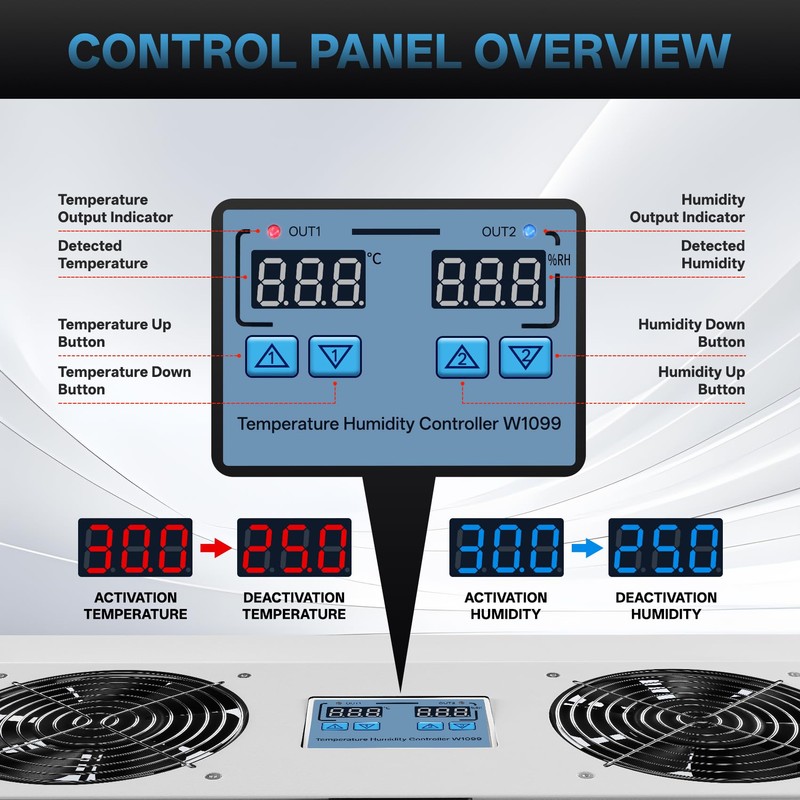 - Smart Dual Humidity & Temperature Control – Auto-activates when humidity (1%-100% RH) or temperature (0°C-100°C) exceeds your preset levels, preventing condensation and mold. Perfect for crawl space fans needing climate-based adjustment. Turns on if either threshold is met