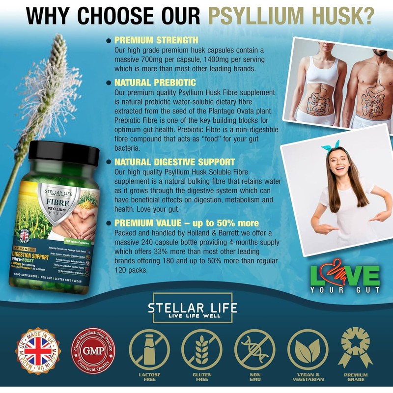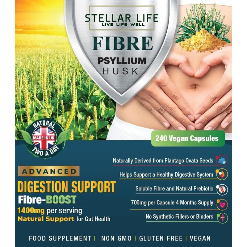 Support digestion and gut health with our 100% natural psyllium husk capsules, providing 1400mg of soluble fibre per daily serving. Derived from Plantago ovata, this vegan-friendly supplement helps maintain regularity and supports bowel function.