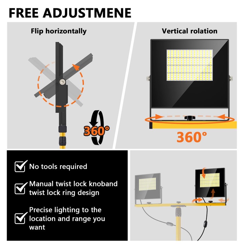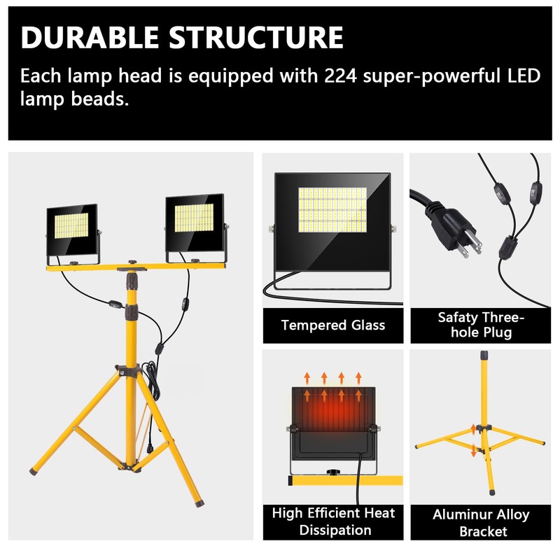 - 【Stability & Widely Used】: The tripod bracket light uses specific clips to link the bracket to the light body, making it sturdy, stable, and not shaking.16 ft power cord is less distance constraint, a wider space for use, not only suitable for construction site lighting but also suitable for outdoor camping And emergency lighting.