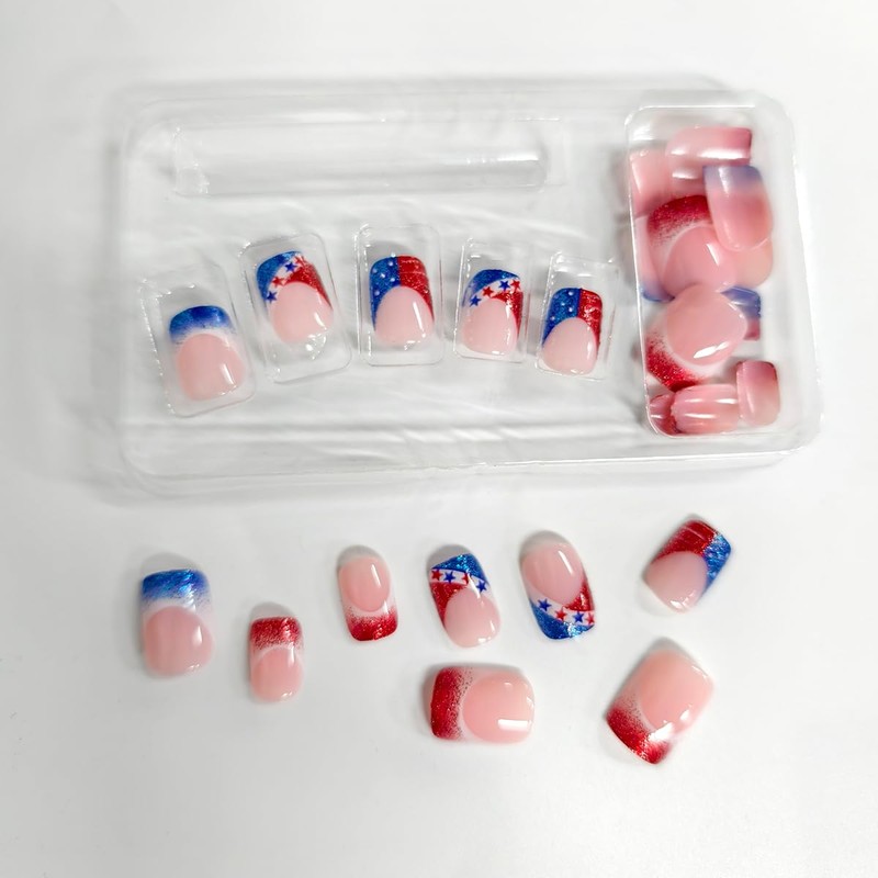 - Package: The packaging includes 24Pcs red blue glitter french tip 4th of July press on nails short square, 1 Nail File, 24Pcs Jelly Glue Stickers, 1 wooden stick, make it easy for you to complete Independence Day nail art decoration
