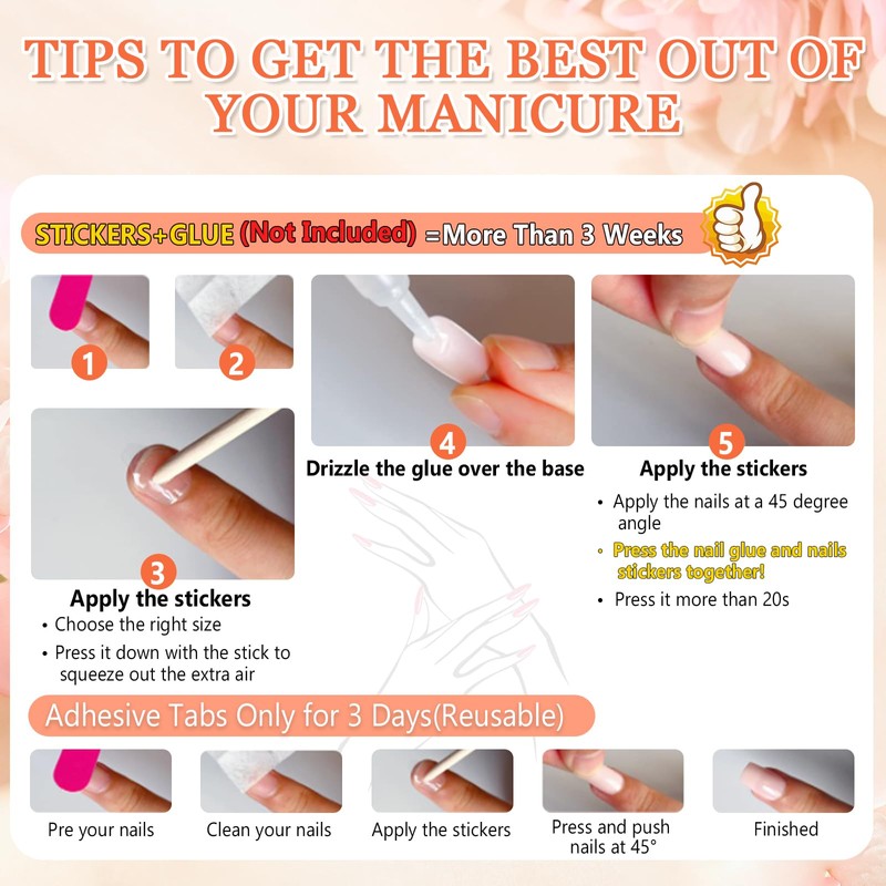 - ✨【Easy to Use】 First, clean your nails and choose the right size of jelly glue stickers to apply. Then, press the matching false nails firmly onto your natural nails and hold for about 20 seconds to secure it. To remove, gently lift the edges with the wooden stick and peel them off. You can change your nails anytime, anywhere, in just 10 minutes, effortlessly refreshing your style.