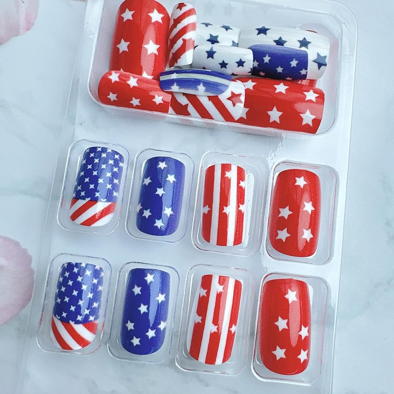 - Easy to Use: Choose the suitable fourth of July press on fingernails, polish the nail bed, paste the jelly glue we give you, press the fashion nail art in 30 seconds, and create the nail art that girls like,If the size is not suitable, it can be polished to the size of the nail cap with a friction tool